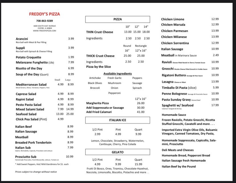 Introducing Freddy's Pizza, a hidden gem located at 1600 S 61st Ave in Cicero, IL. This old-school Italian deli offers a wide range of options including penne with marinara, rigatoni with vodka sauce, meatball sandwiches, calamari pizza, fried artichokes, and gelato. The ambiance is authentic and friendly, with everything made in-house with care and love. Customers rave about the delicious flavors and generous portions, making it a favorite spot for both locals and visitors. With options for takeout, delivery, reservations, and catering, Freddy's Pizza is a must-visit destination for anyone craving traditional Italian cuisine in a welcoming setting.